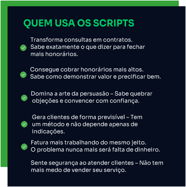 Ter acesso aos scripts de vendas para advogados, que foram validados por 16 anos, com as melhores abordagens e técnicas de vendas.