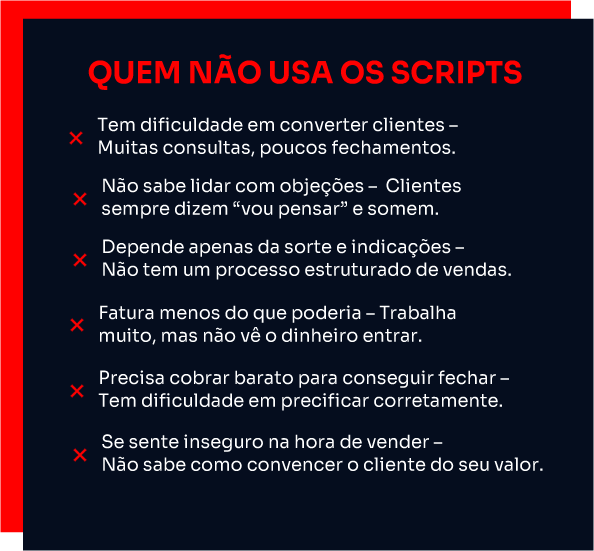Você vai receber um ebook com vídeos explicativos, mostrando o passo a passo dos scripts de vendas.