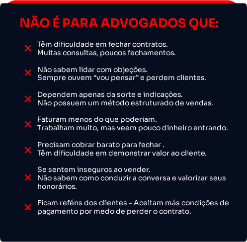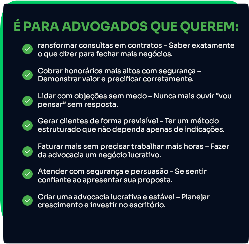 Funciona para todo e qualquer advogado que deseje aumentar o seu faturamento e vender mais honorários.